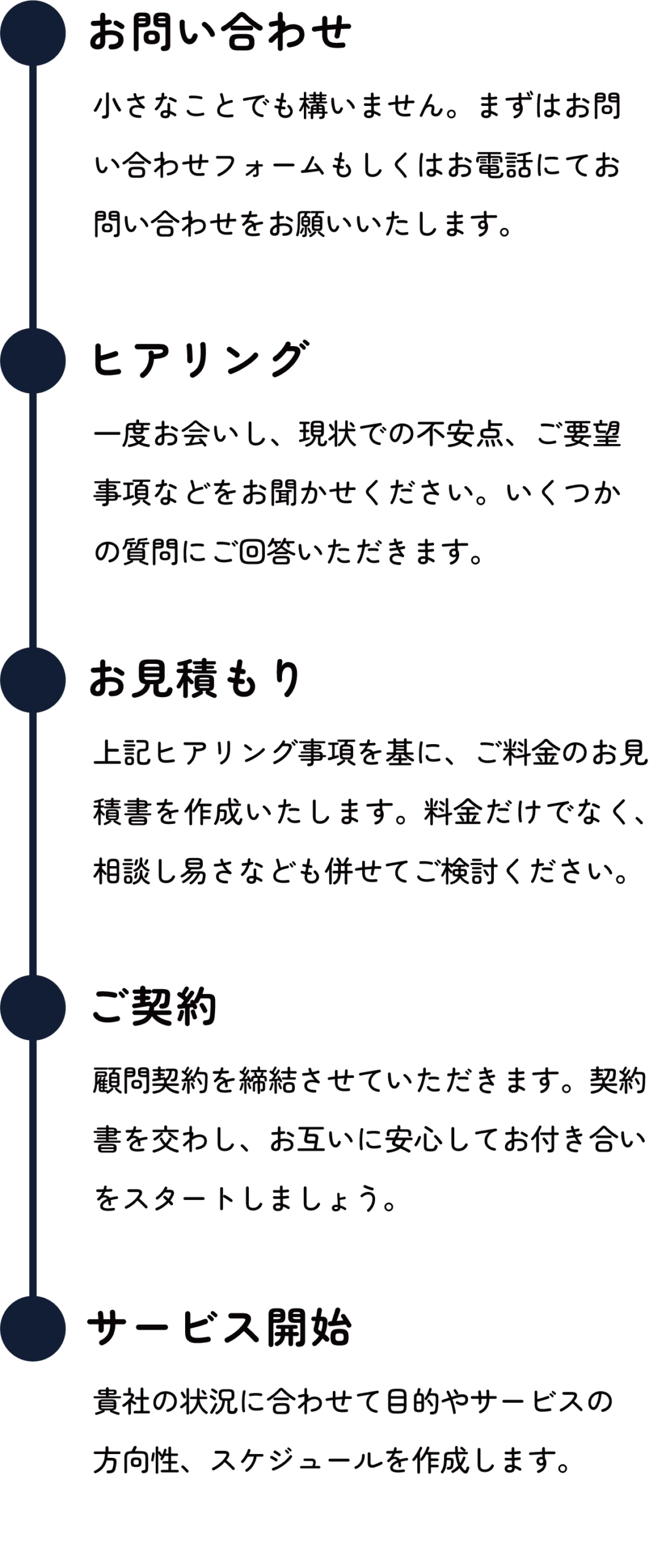 企業の抱える課題は、創業期、成長期、成熟期といったステージによって刻々と変化します。当事務所では、日々の記帳代行や決算業務はもちろん、創業時の資金調達から、成長期の節税対策、そして将来の事業承継まで、お客様の「今」の状況に合わせたきめ細やかなサービスをご用意しています。「何から相談していいかわからない」という場合でもご安心ください。現状をヒアリングし、最も必要なプランをご提案いたします。